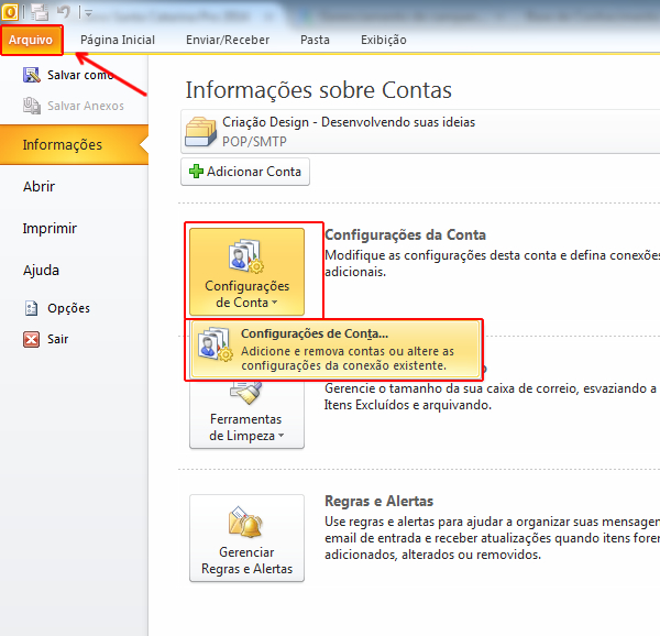 2 - Dentro do menu "Arquivos" clique na opção Configurações de Conta e em seguida novamente em configurações de conta...