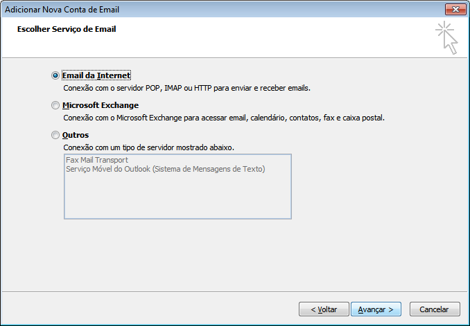 6 - Escolha tipo de serviço - Selecione a opção "Email da Internet", POP ou IMAP e em seguida clique em avançar.