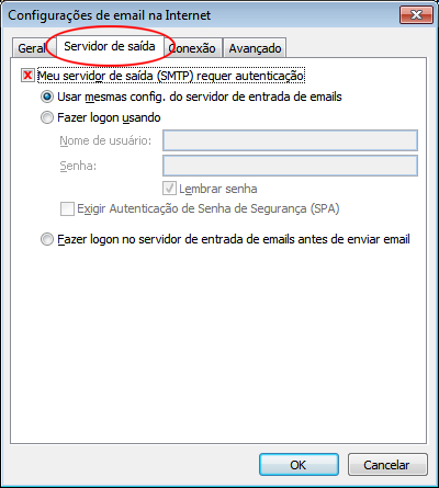 8 - Abra a aba Servidor de Saída e selecione a opção "Meu Servidor de Saída (SMTP) requer autenticação, em seguida clique na aba Avançado